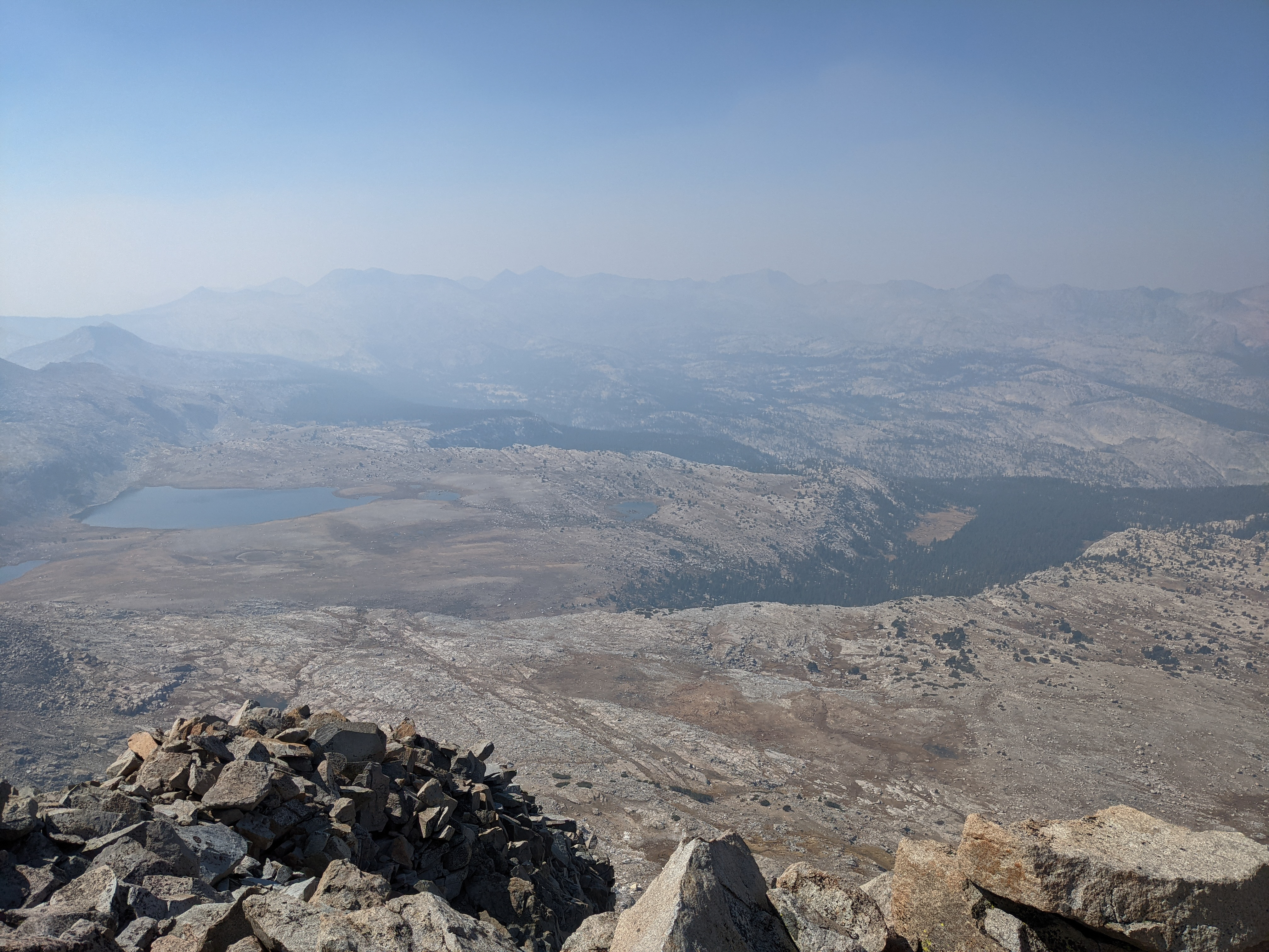 Soon, we reached the summit rocks and had a view to the east. It was quite smoky, we could barely make out Mount Ritter just a few miles to our east.