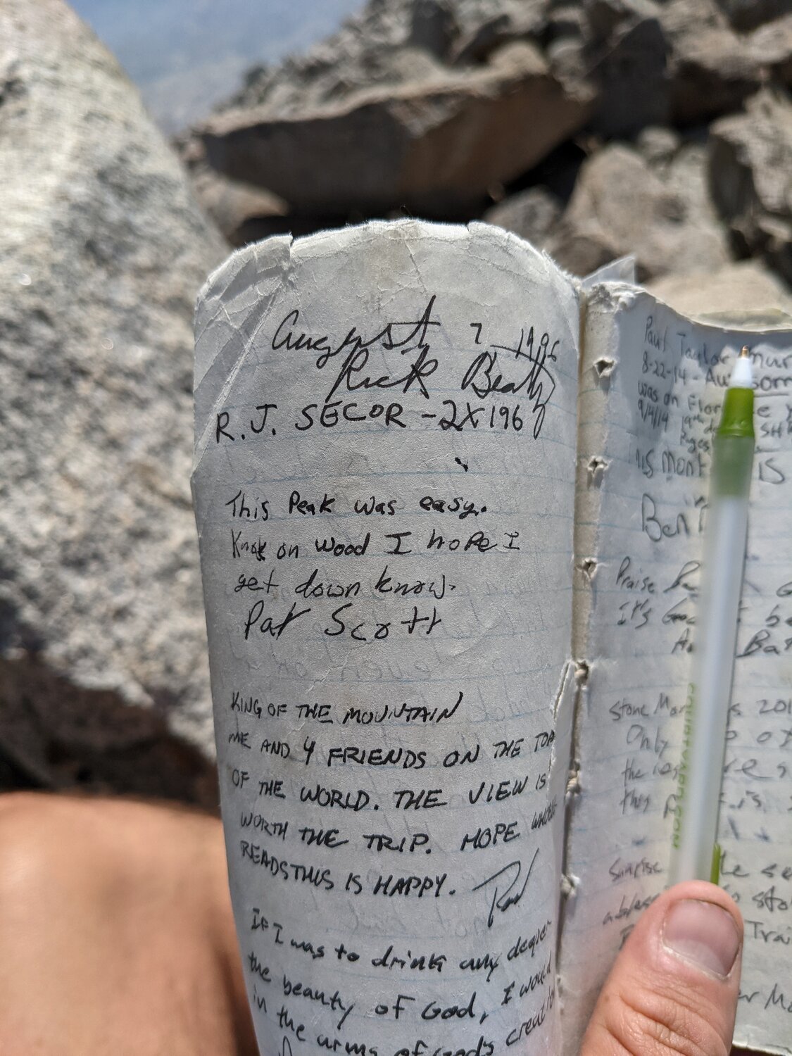 Another Secor entry in the register atop Foerster Peak. We revised our plan and instead decided to head directly for the Isberg Pass Trail from our backpacks and skip Harriet Lake. We only sat for a few minutes before heading back down the tippy rocks of the north face.