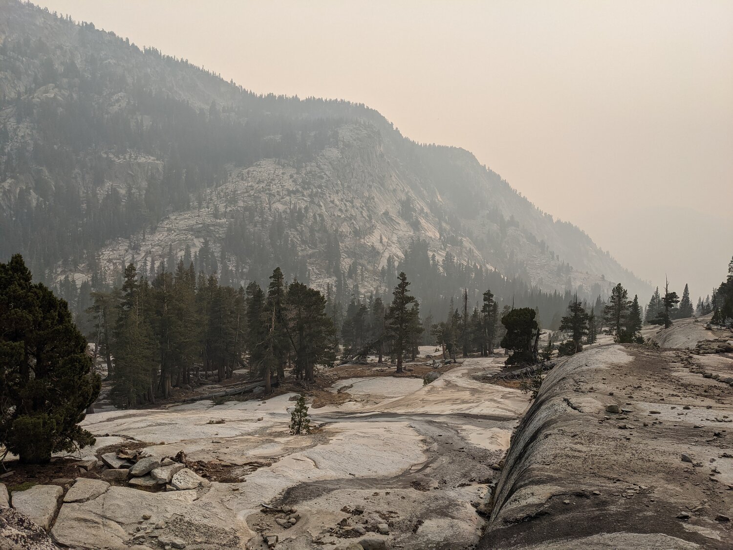 Looking back south from near the crossing of the Lyell Fork. The Isberg Pass Trail traverses a bench high above the Merced and would have some impressive views to the west along much of its length. Unfortunately, we couldn’t see much through the smoke, so we just put our heads down and hiked.
