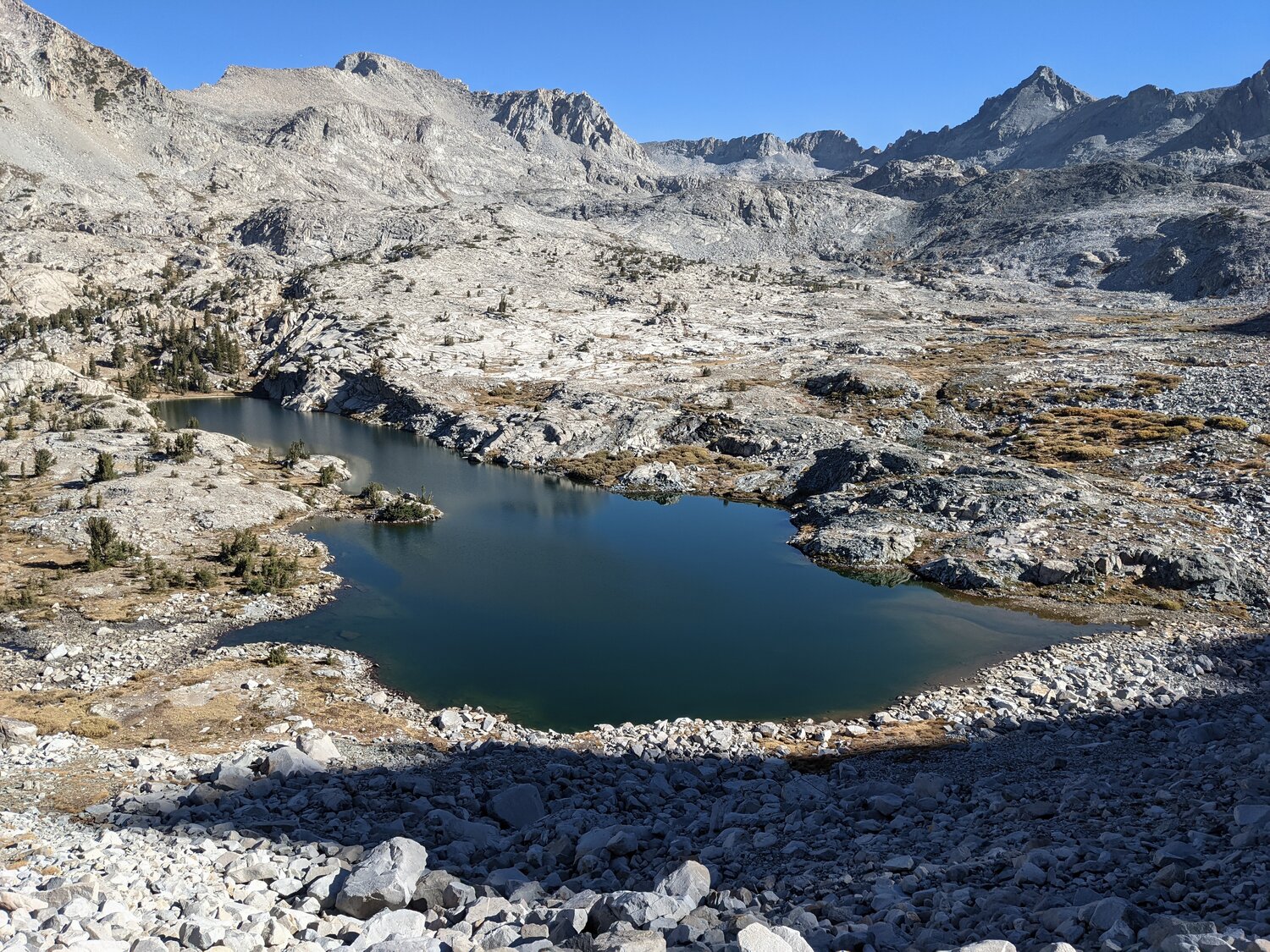 Shannon descending to the Lyell Fork. We discussed a plan, at this point our sole focus was getting back to Tuolumne Meadows as we didn’t expect the smoke to clear at all in the next day or so. It was a bit too far to make it back this evening, so we figured we would just take the most direct route back over Vogelsang Pass and get there tomorrow. We would just have to see how far we got today.