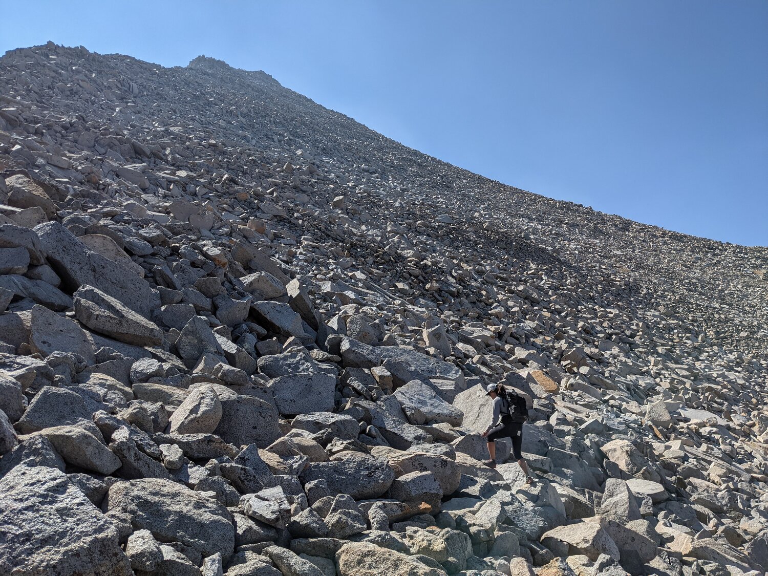Shannon climbing boulders towards Foerster Peak. The rocks here were very loose. Most of them shifted under our weight but thankfully none of them released and fell down the mountain. Nevertheless it was slow going for a while.