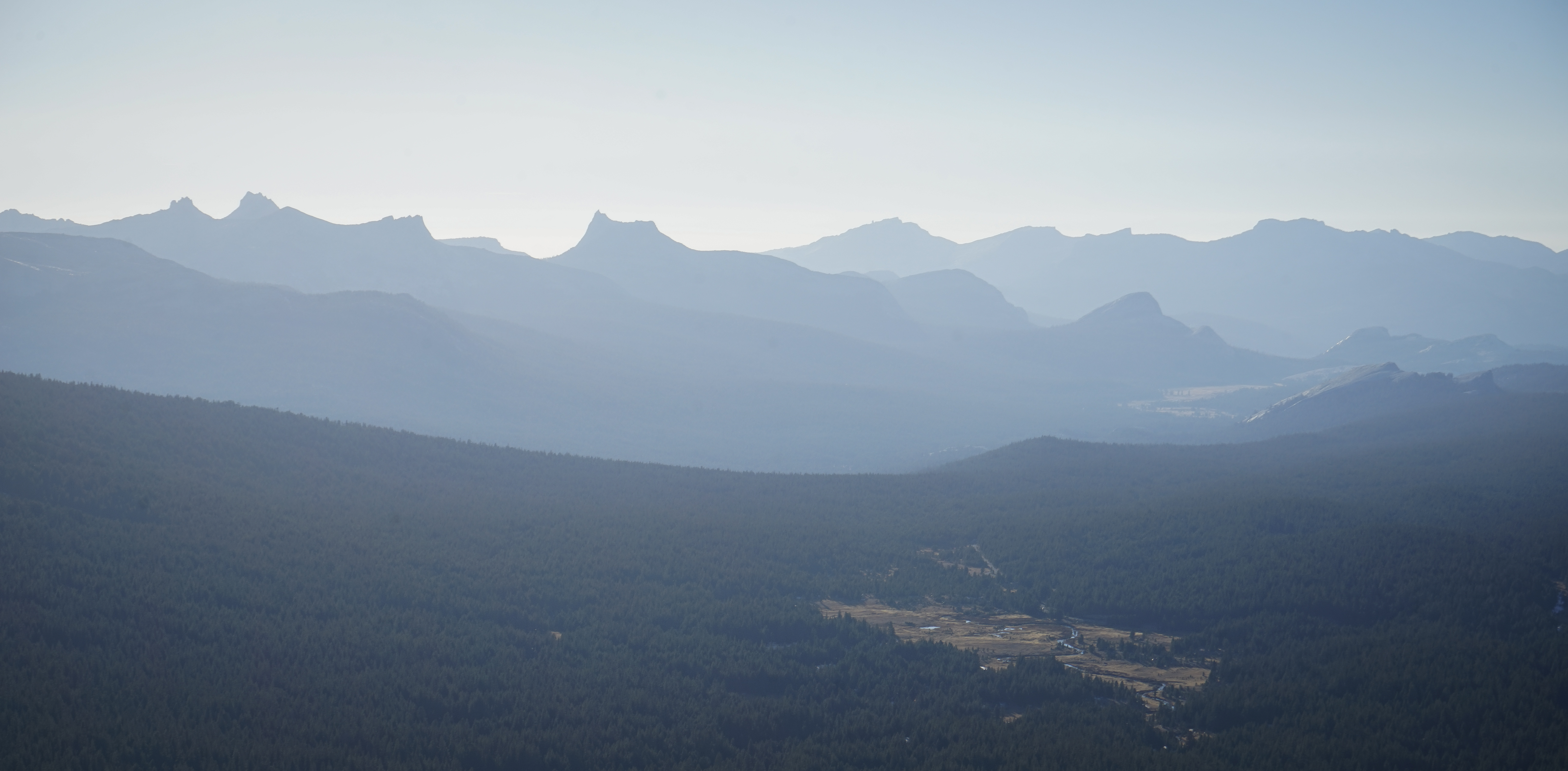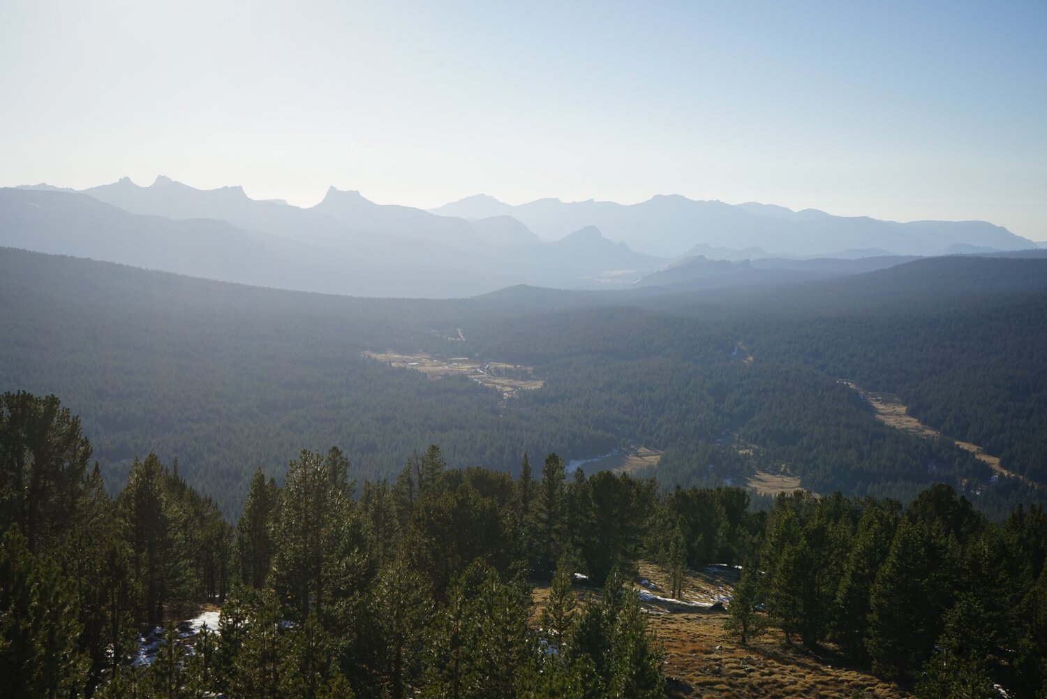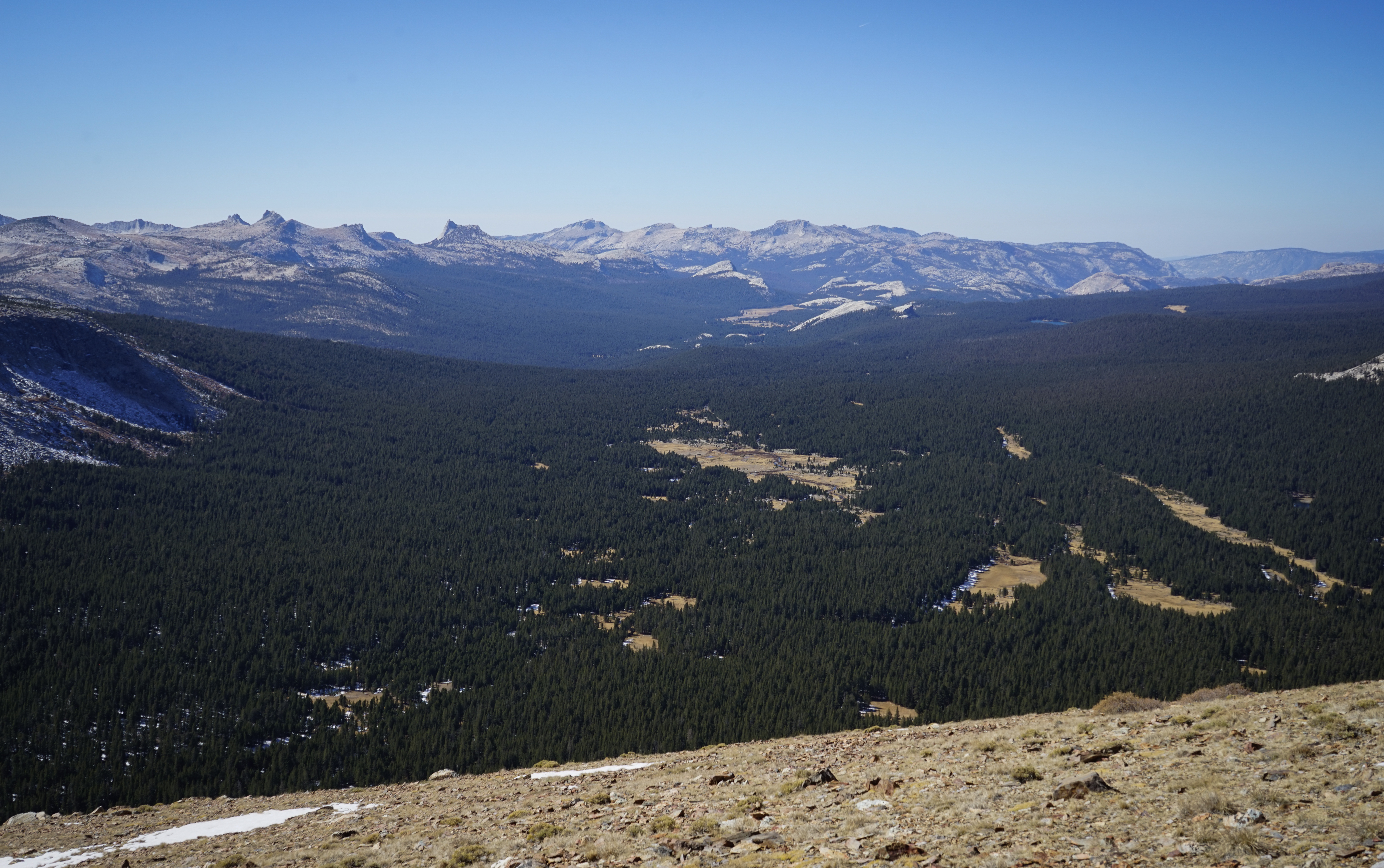 Tuolumne Meadows and the Cathedral Range from the slopes of Mount Gibbs.