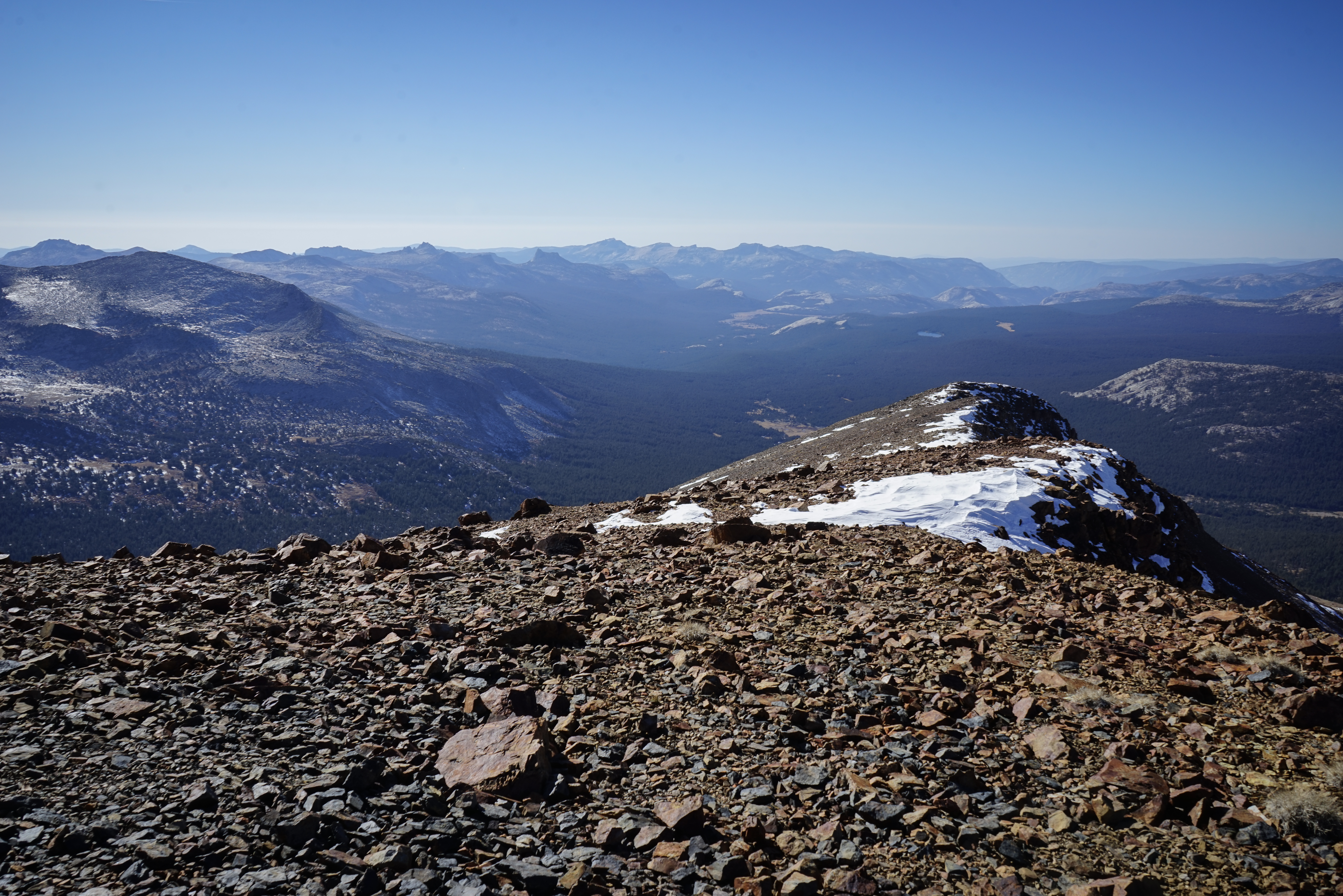 Looking north towards Mount Conness from the flat part of the ridgeline near the summit. We continued down and down over easy terrain. Shannon’s headache from the altitude became worse on the descent, unfortunately.