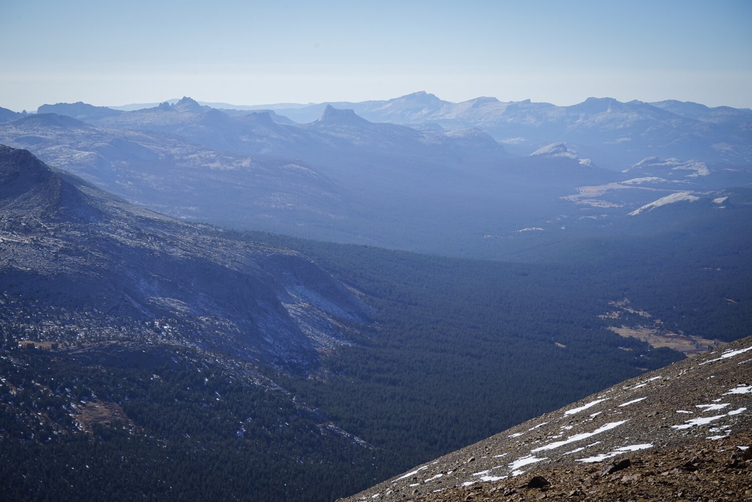 Higher up, Mount Lyell and Mount Maclure came into view across Kuna Crest. There was a light dusting of snow from a storm a week or so ago, but it had mostly melted on the west and south aspects.